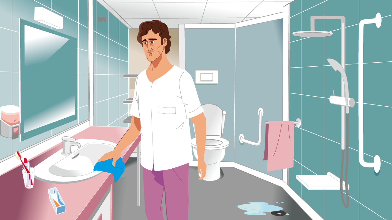 Dans une salle de bains, Mickaël réalise le nettoyage du lavabo. Ne lui manque-t-il pas quelque chose ?